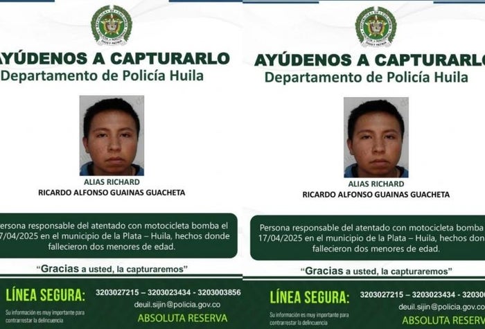Y es que, tras la captura de alias ‘Karla’ y ‘Alex', alias ‘Richard’ es el presunto autor material del atentado con motobomba perpetrado el pasado 17 de abril en el municipio de La Plata, que dejó como saldo la muerte de dos jóvenes de una misma familia y varias personas heridas. Alias “Richard” dejó la moto momentos previos a la explosión.