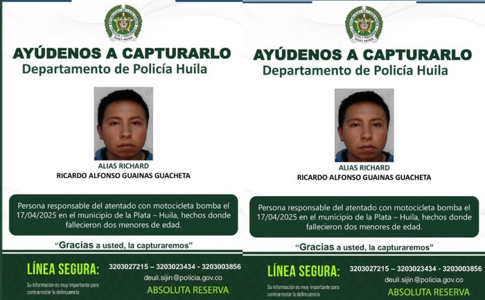 “Este sujeto es señalado como el presunto autor material del atentado con motobomba perpetrado el pasado 17 de abril en el municipio de La Plata, que dejó como saldo la muerte de dos jóvenes de una misma familia y varias personas heridas. Alias “Richard” es requerido por los delitos de concierto para delinquir, terrorismo y homicidio agravado”, aseguró el Mayor General Carlos Fernando Triana.