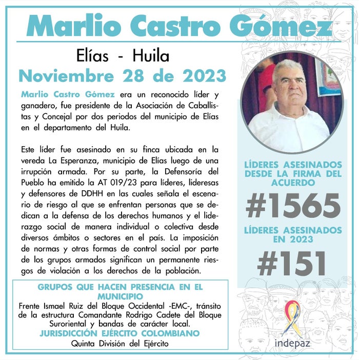 Marlio Castro Gómez, ganadero y presidente de la Asociación de Caballistas y quien además fue concejal del municipio de Elías, en el departamento del Huila, fue asesinado en las últimas horas.