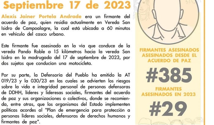Por otro lado, el Instituto de Estudios para el Desarrollo de la Paz (INDEPAZ), advirtió que desde la firma del acuerdo de paz ya son 385 las víctimas ultimadas en Colombia, de los cuales 15 han sido en el departamento del Huila, y durante el año 2023, 29 firmantes de acuerdos de paz han sido asesinados en el país.