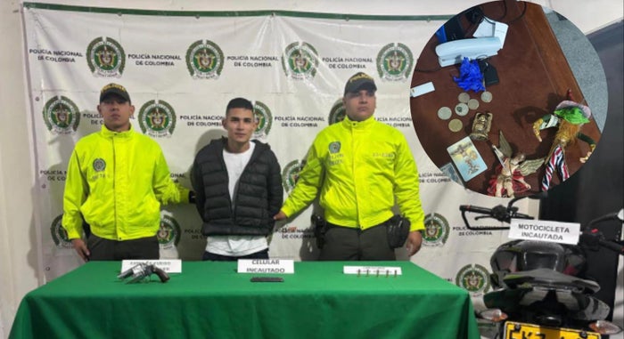 La acción adelantada para la captura se logró con el apoyo del grupo GOES, inteligencia policial y uniformados del nuevo servicio de Policía orientado a las personas y los territorios, se logró la incautación de un arma de fuego con cinco cartuchos, una motocicleta, un teléfono celular”, dijo Téllez.