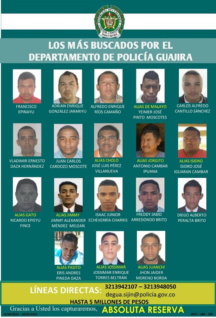 Asimismo, aparecen Francisco Epinayu, Adrian Gonzalez, Alfredo Enrique Ríos, Yeimer Pinto, Carlos Cantillo, Juan Carlos Cardozo, Eris Andrés Pineda, Jhon Jaider Moreno, Jossimar Enrique Torres, quienes son buscados por los delitos de homicidio y fabricación, tráfico, porte o tenencia de armas de fuego, accesorios, partes o municiones.