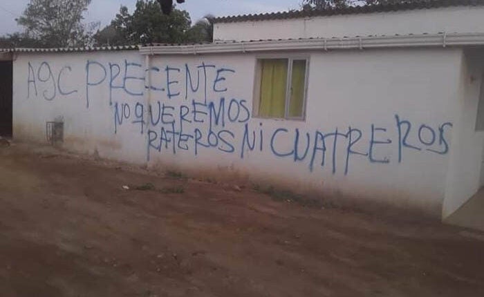 El mensaje intimidante que se puede leer en las calles del pueblo fue escrito con letras azules y dice lo siguiente: “Las A.G.C. presente, no queremos rateros ni cuatreros”. El propósito de estos grupos es perturbar la tranquilidad de la comunidad.