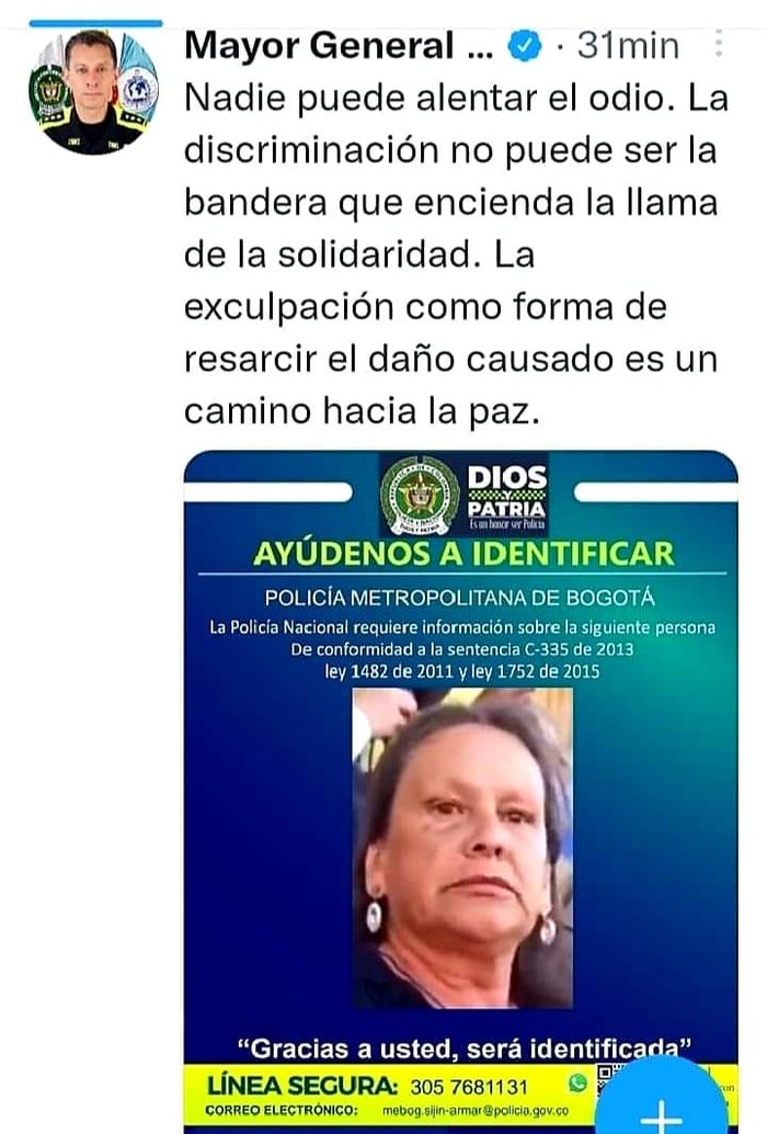 Entretanto, el director de la institución, Mayor General Henry Armando Sanabria Cely, rechazó los comentarios de la mujer. "Nadie puede alentar el odio. La discriminación no puede ser la bandera que encienda la llama de la solidaridad. La exculpación como forma de resarcir el daño causado es un camino hacia la paz", indicó al respecto.