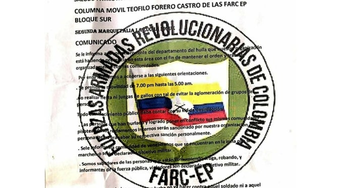 En el Huila, las autoridades se encuentran investigando la veracidad de un panfleto, al parecer de la Columna Teófilo Forero FARC bloque Sur, que empezó a circular en la zona rural de Neiva y en diferentes municipios, el mensaje principalmente es el de dar cumplimiento a las medidas de aislamiento para evitar los contagios de Covid-19, asimismo, se prohíben fiestas, peleas de gallos y hay restricción de movilidad.