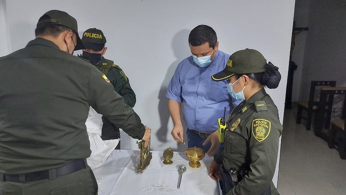 Es así como los uniformados del CAI de los Periodistas, en una rápida reacción y gracias a la presión ejercida por el personal de los cuadrantes e información de la red de participación cívica, lograron en menos de 24 horas, la recuperación de un copón donde se guardan las hostias, un biril, un porta viático, un atril de Biblia, un naveta y un isopo.