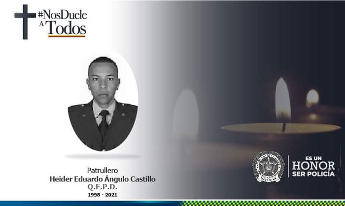 Asimismo, "la Policía se solidariza y expresa sus sentidas condolencias a los familiares del patrullero Heider Eduardo Angulo Castillo, quien nació en 1.998 y era oriundo de Cali", se indicó.