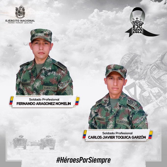 "Dos de nuestros hombres fueron vilmente asesinados, los soldados profesionales Fernando Aragonez Nomelin y Carlos Javier Toquica Garzón, oriundos de Caquetá y Meta, quienes llevaban más de un año en la institución", dijo el Ejército a través de un comunicado.