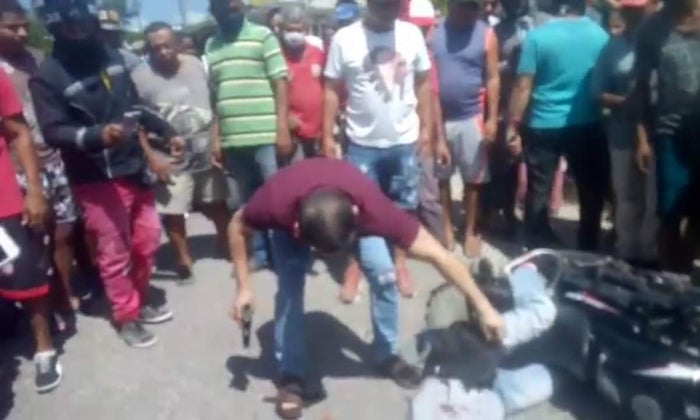 Así mismo, luego de cometido el hecho, el delincuente sale para donde se encontraba la moto parqueada, pero estos no se percatan de que el señor oficial portaba una arma de fuego legal, y les dispara en varias ocasiones dejándolos heridos en el lugar .