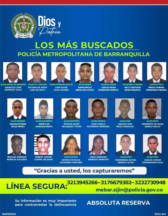 En el marco del Plan Recompensas La Policía Nacional y la Alcaldía Distrital de Barranquilla da a conocer el cartel de los más buscados por el delito de homicidio. En total, se identifican 19 presuntos delincuentes en dicho cartel, con el fin de obtener información de la comunidad.