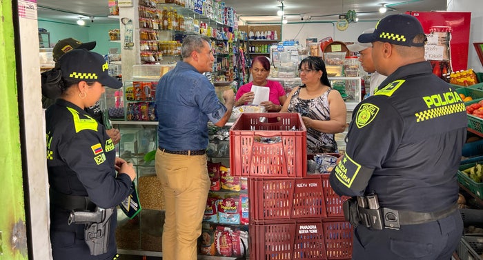 Durante el recorrido por el barrio estuvo el General(ra) Mariano Botero Coy, asesor de seguridad de la secretaría de convivencia y seguridad ciudadana de la alcaldía, impartiendo recomendaciones a los comerciantes e invitándolos a confiar en las autoridades.