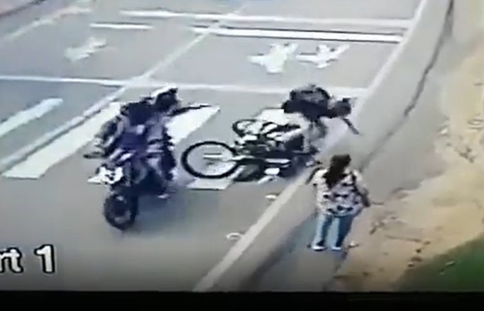 Dos videos de cámaras de seguridad instaladas en una calle el municipio Bello en Antioquía, deja ver el angustiante momento en el que dos hombres a bordo de una motocicleta intentar robarle el bólido a otro sujeto.
