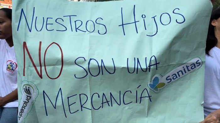 Con arengas como, "la salud de nuestros hijos no puede esperar por papeleos, nuestros hijos no son una mercancía, y no más barreras, nuestros hijos necesitan transportes sin trabas", se acercaron hasta las puertas de la sede sede Nuevo Horizonte de Sanitas, ubicada en la carrera 47 con calle 84.