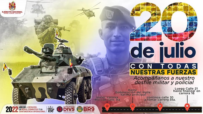 A las 09:00 de la mañana está previsto el inició de un imponente desfile Militar, de Policía e interinstitucional, toda vez que además contará con la participación de las bandas marciales de las instituciones educativas, Bomberos, Defensa Civil e Inpec, entre otros.El recorrido que tendrá inicio en la carrera cuarta con calle primera, avanzará hasta la Gobernación del Huila, donde estará situada la tarima principal; el desfile continuará por calle 10 para tomar la carrera quinta y así seguir por la calle 21, para terminar en la carrera 16.