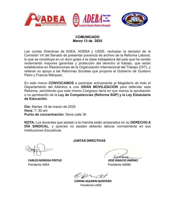 Las Juntas Directivas de ADEA, ADEBA y USDE, enviaron un comunicado señalando que, rechazan la decisión de la Comisión VII del Senado de presentar ponencia de archivo de la Reforma Laboral, "Constituye en un duro golpe a la clase trabajadora del país que ha venido reclamando mayores garantías y protección del derecho al trabajo, que están establecidos en Resoluciones de la Organización Internacional del Trabajo (OIT), y reiteran su apoyo a las Reformas Sociales que propone el Gobierno de Gustavo Petro y Francia Márquez", expresaron a través del comunicado.