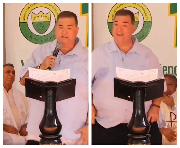 El hecho, que quedó registrado en video, generó carcajadas entre los presentes, incluidos cuatro sacerdotes que estaban tras el mandatario en la tarima y hasta la asistente de Chams, quien de inmediato acudió en su ayuda.