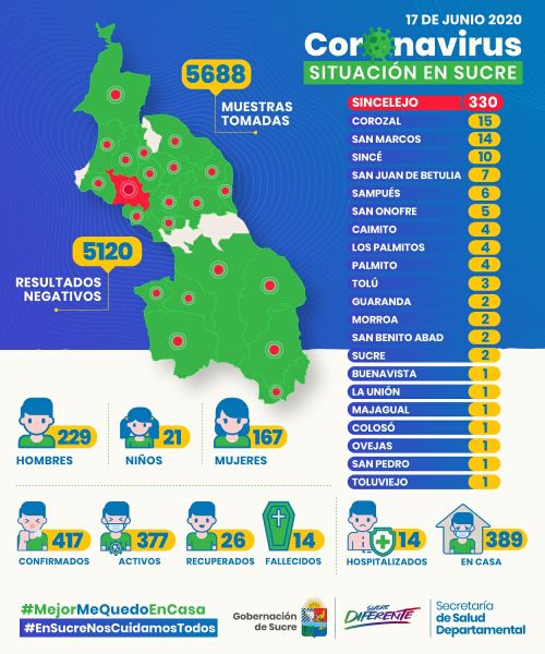 El departamento de Sucre amaneció con 417 casos de coronavirus, luego de que la Secretaría de Salud departamental de Salud diera a conocer el número de casos del día de ayer, el cual llegò a 85 casos y un fallecimiento.