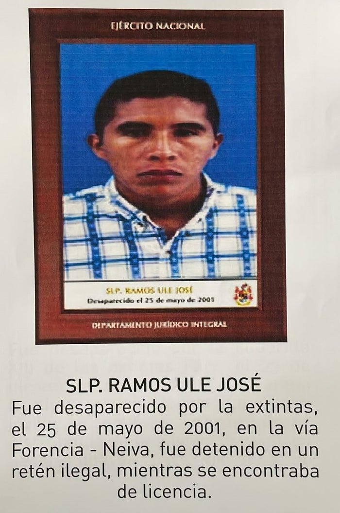 - Soldado Profesional José Ramos Ulé: Desaparecido por las extintas Farc el 25 de mayo de 2001 en la vía Florencia – Neiva; fue detenido en un retén ilegal mientras se encontraba de licencia.