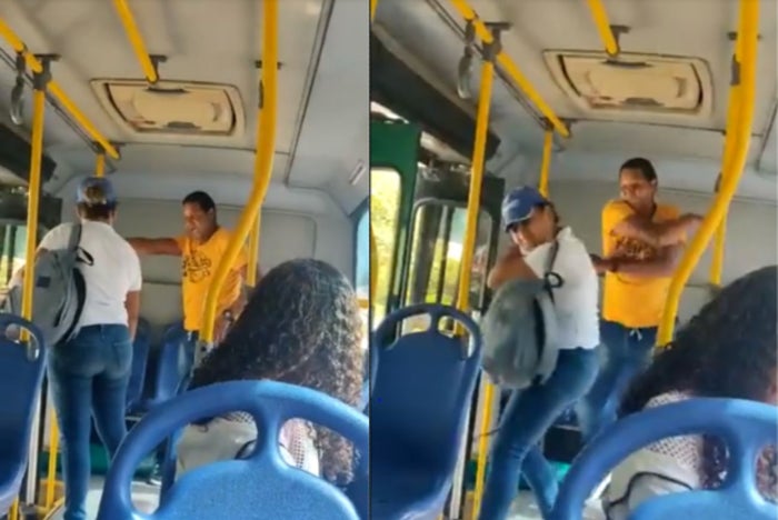 Los pasajeros de los bus sorprendidos deciden meterse para acabar con la pelea, sin embargo, el hombre sigue gritando: "¡Ella me tiene que respetar! ¿Cómo me va a pegar a mí? Si ella me pega, yo le pego. La mujer que me venga a pegar, yo le pego su cachetada también, pa’ que respete. Dale, compi”.