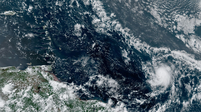 El sistema se encuentra en este momento, en medio del océano Atlántico, a unos 2.000 kilómetros de las Islas de Barlovento, o Antillas Menores, hacia donde se dirige soplando con vientos máximos sostenidos de 96 km/hora.