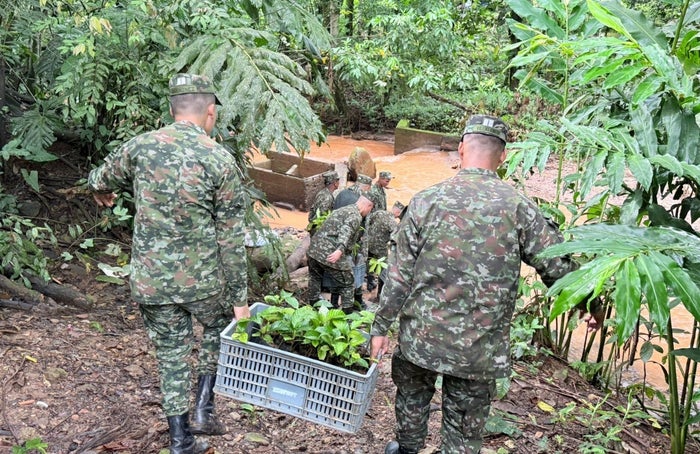 Durante la última jornada de siembra, los participantes entre ellos soldados, campesinos, líderes comunitarios y voluntarios ambientales realizaron actividades como el embolsado de semillas, la adecuación del terreno y el trasplante en tierra, asegurando las condiciones adecuadas para que cada especie plantada crezca y contribuya a la restauración de los suelos y la captura de carbono.