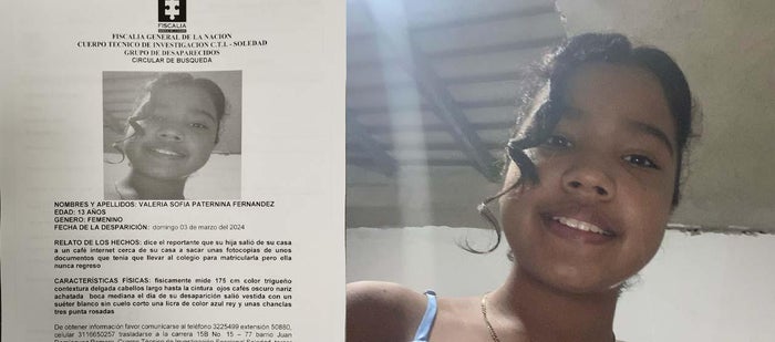 El CTI de la Fiscalía reportó la desaparición de Valeria Sofía Paternina Fernández, de 13 años, en el municipio de Soledad.