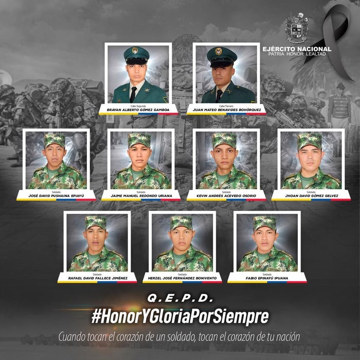 El Ejército responsabiliza a integrantes del grupo armado organizado (GAO) ELN, del Frente Camilo Torres del asesinato de nueve militares y de los otros nueve soldados heridos.