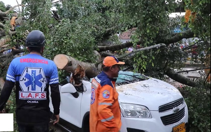 Gustavo Paba, coordinador de la Oficina Gestión del Riesgo en Ocaña, dijo a RCN " el municipio de Ocaña, enfrentó un fuerte aguacero durante 45 minutos en donde las lluvias originaron la caída de un árbol de 25 metros de altura en la avenida Francisco Fernández de Contreras sobre cuatro vehículos y en un local comercial en donde se encontraban varios niños".