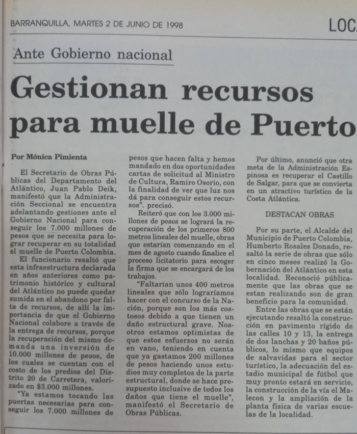 El Secretario de obras públicas del departamento del Atlántico, en ese entonces, Juan Pablo Deik, manifestó que la administración seccional se encontraba adelantando gestiones ante el gobierno nacional para conseguir los 7.000 millones de pesos que se necesitaba para lograr recuperar en su totalidad el muelle.