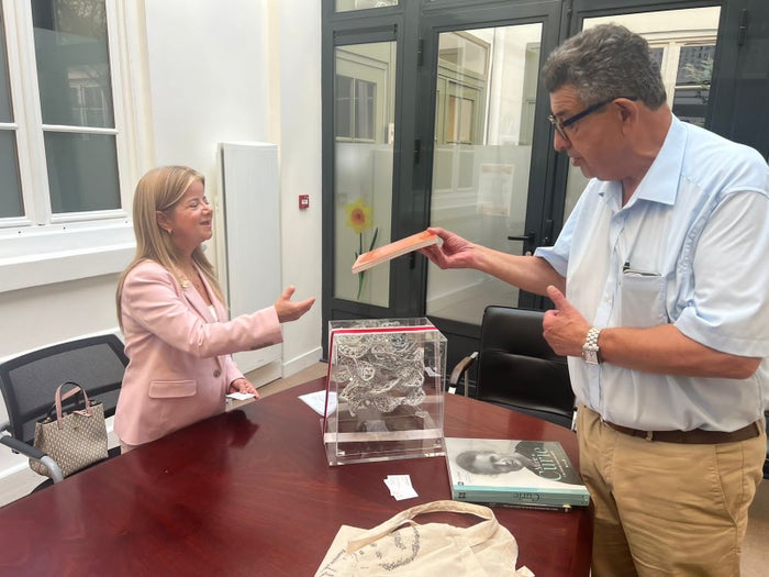 Durante la visita de la delegación de Artesanías del Atlántico a París, en el marco de la Feria Maison & Objet, la gobernadora, Elsa Noguera, entregó al presidente del Instituto Curie, Thierry Phillip, la exposición permanente de artesanías para esta importante entidad.