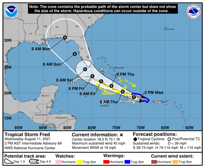 La sexta tormenta de la temporada de huracanes del 2021 ya se formó. Se trata de ‘Fred’, cuya consolidación se produjo en la noche del martes 10 de agosto frente a la costa de Puerto Rico y avanza hacia la Isla Española, con rumbo a Florida, en Estados unidos.