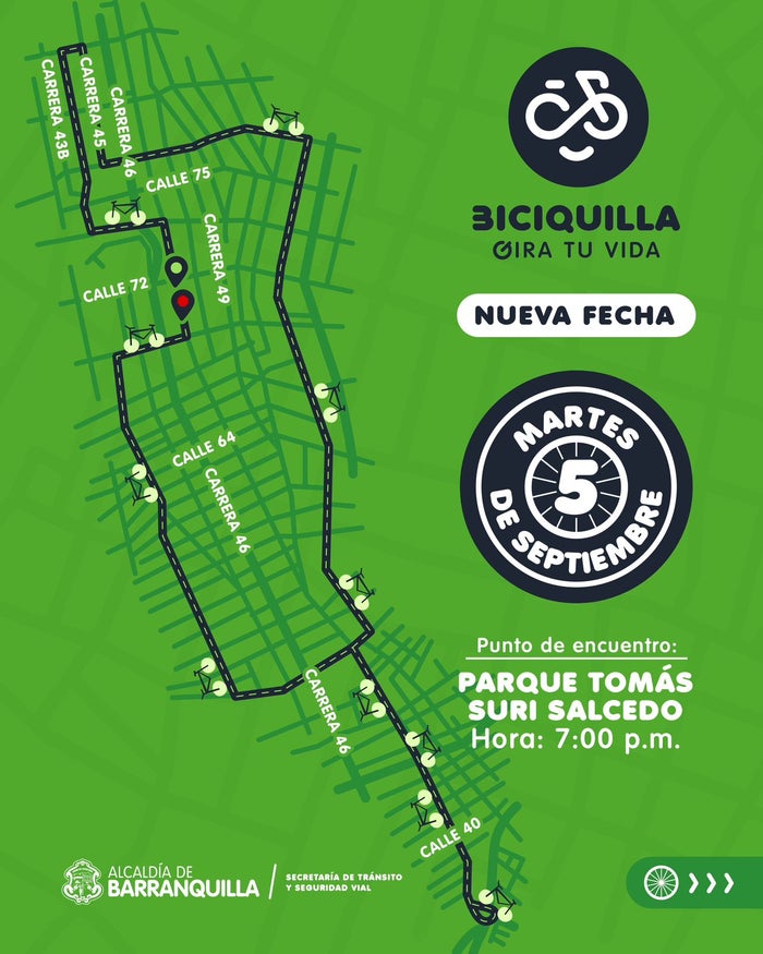 Recuerden que semanalmente a través de nuestras redes sociales estaremos compartiendo el recorrido y el punto de encuentro de cada Biciquilla. En Instagram y Twitter nos encuentras como @transitobaq y en Facebook como Secretaría Distrital de Tránsito y Seguridad Vial.