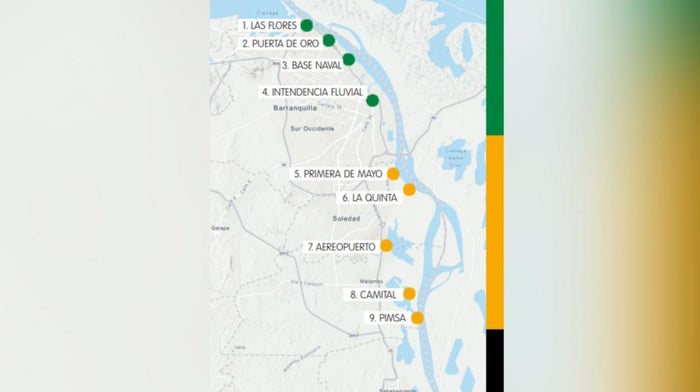 El proyecto en su totalidad contempla nueve embarcaderos que trazan la ruta desde Las Flores hasta Pimsa, a lo largo del río Magdalena, que conectarán no solamente en el perímetro sino a través del sistema de canales de la ciudad. Son aproximadamente 33 kilómetros (sin contemplar los caños).