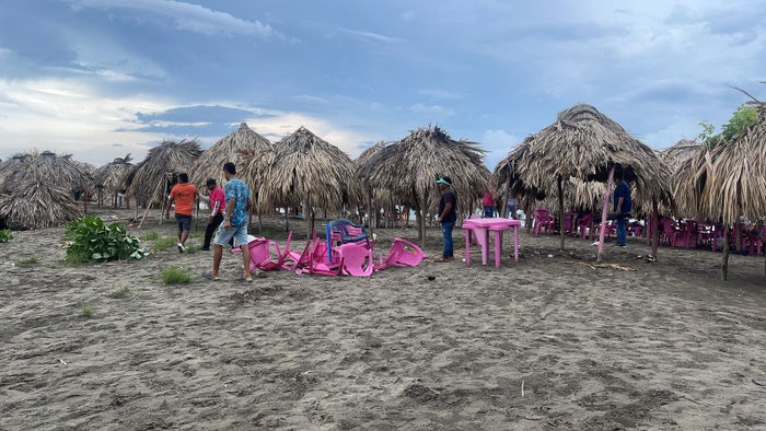 Las personas que se encontraban en el lugar, tuvieron que correr para resguardar sus vidas ya que las fuertes brisas hicieron volar sillas, mesas, objetos y varios kioscos de palma cayeron al suelo.