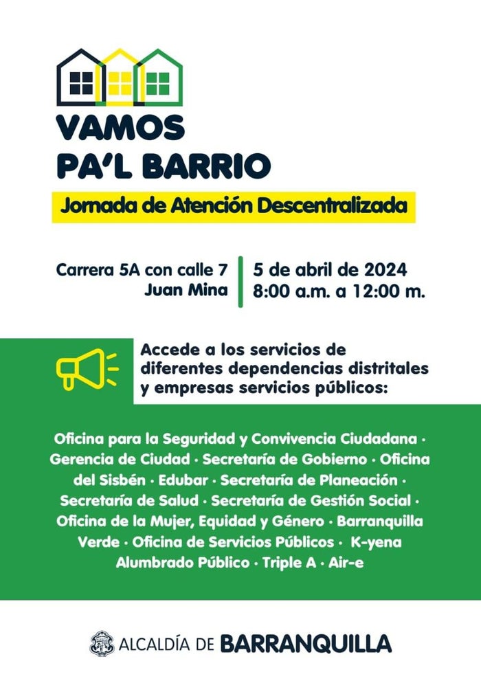 La oferta institucional de la Alcaldía de Barranquilla a través de sus diferentes dependencias distritales llega este viernes 5 de abril, bajo el liderazgo del alcalde Alejandro Char y la Gerencia de Ciudad, a Juan Mina, en compañía de empresas de servicios públicos y otras entidades.