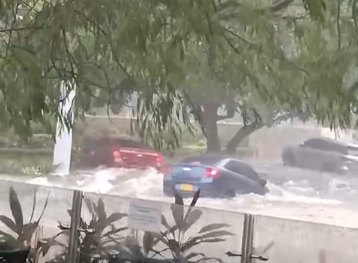 En la imagen se observa un incidente registrado en la calle 85 con carrera 50, zona norte de la capital del Atlántico, donde dos vehículos fueron arrastrados por el fuerte caudal de un arroyo ante la presencia de varios ciudadanos que no pudieron evitar el hecho por la fuerza de la corriente.