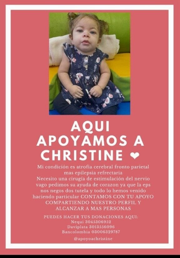 “Esto inició cuando Cristine tenía 2 meses. Por eso hoy acudo a ustedes, a su buen corazón …porque siento que he perdido mucho tiempo esperando y tratando de hacer las cosas por medio de la eps, pero que ha sido imposible porque no contamos con el apoyo de la parte médica que viene atendiendo a Cristine”.