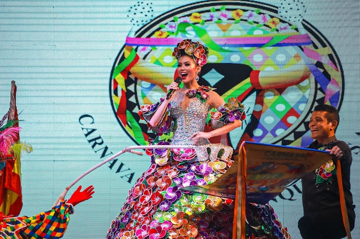 "Por los héroes de la salud que andaban batallando…Y por cada uno de ustedes mis carnavaleros, que, a final de cuentas, este Carnaval hace rato andaban esperando. Pero, sobre todo, este 2022 va por todos los que se fueron, por quienes pido un cipote aplauso que se escuche en lo más lejano del cielo", dijo Valeria, quien lució un vestido llamado 'Las Trinitarias', diseño original de Alfredo Barraza.
