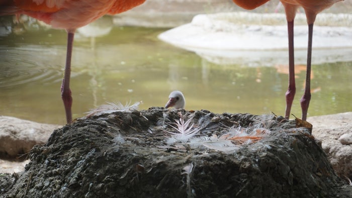 Por primera vez en el Zoológico de Barranquilla nació un polluelo de flamenco caribeño, luego 27 días de incubación en uno de los nidos elaborados por sus padres, en la Ciénaga de este centro de conservación.