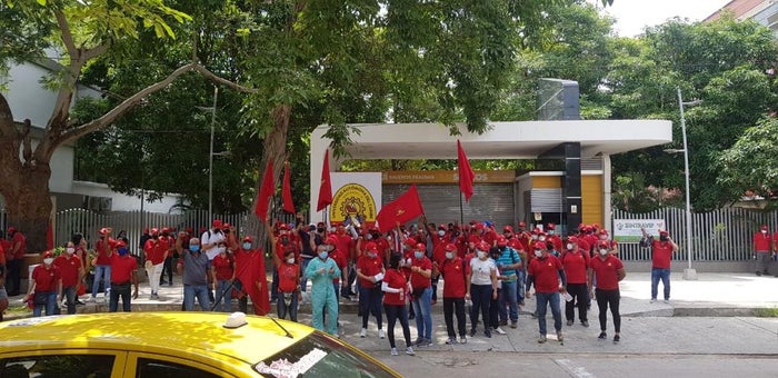 Trabajadores de la Universidad Autónoma del Caribe, en Barranquilla, adelantaron este martes un plantón, a las afueras de la institución, con el fin de rechazar la suspensión de cientos de contratos laborales.