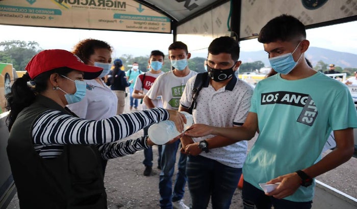 Los estudiantes fueron recibidos en el corredor escolar, instalado en la mitad del puente, por la secretaria de educación de Norte de Santander, Hilse Aldana, y la de Cúcuta, Jessica Ramírez, quienes aplicaron en los jóvenes todas las recomendaciones y medidas de bioseguridad.