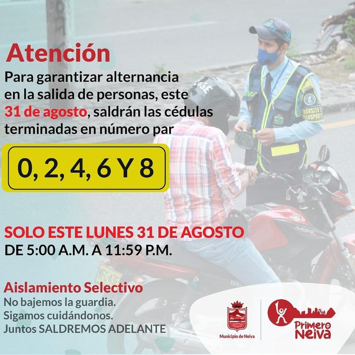 “Con la entrada en vigencia del nuevo Decreto de medidas en Neiva, se modifica el pico y cédula para este lunes, con el ánimo de garantizar la alternancia en la salida de personas. Este día podrán salir las personas cuyas cédulas terminen en par. *Solo aplica para este día*”. Lo que quiere decir que se acogen a la medida los números 2 - 4 - 6 - 8 - 0.