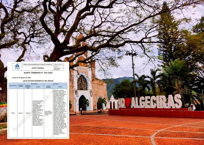 El municipio de Algeciras enfrenta una situación compleja, según la Personería la circulación de panfletos y las constates amenazas han generado al menos 43 declaraciones en los últimos meses, que han ocasionado la salida de 200 personas amenazadas, entre los que se encuentran 70 menores, por lo que la Defensoría del Pueblo emitió la Alerta Temprana N° 043-2020.