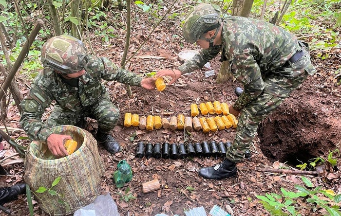 En el lugar se hallaron 26 minas antipersonal, 45 artefactos explosivos improvisados con sistema de activación por mecha de seguridad, 103 metros de cordón detonante de diferentes gramos, 67 metros de mecha de seguridad, 20 detonadores eléctricos y 40 jeringas.
