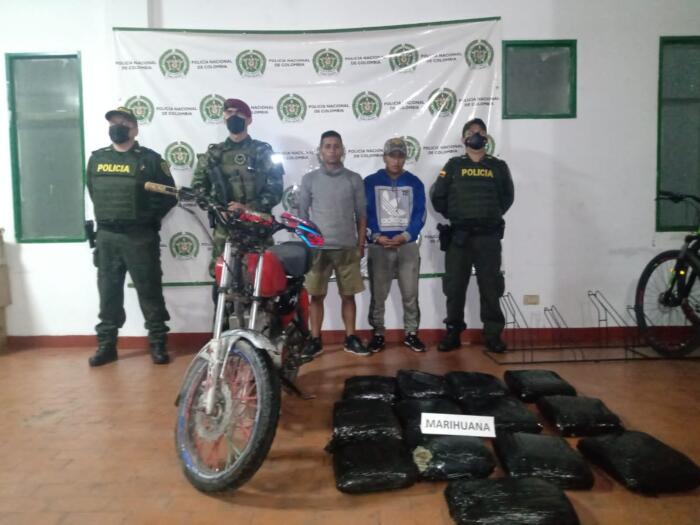 En flagrancia Uniformados de Policía Huila capturaron a dos hombres de 21 y 24 años de edad a quienes en un puesto de control les fue hallado en su poder 33 kilos de marihuana, camuflada en el tanque y tapas de una motocicleta.