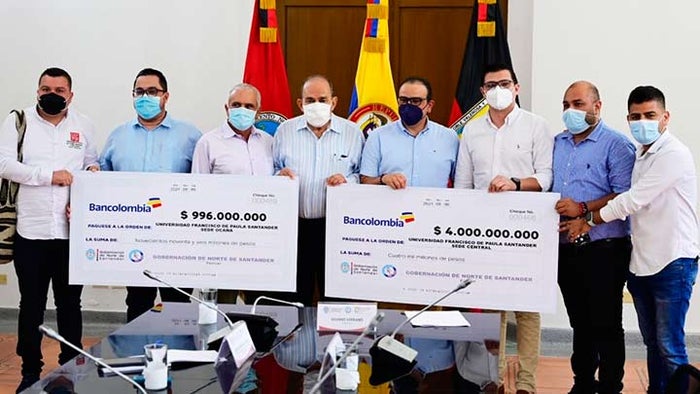 Con presencia del rector del alma mater de Cúcuta, Héctor Parra, y de Édgar Antonio Sánchez, en representación de la seccional de Ocaña, el gobernador realizó la la primera entrega, el monto del cheque asciende a los 4.000 millones de pesos, mientras que a la segunda le correspondieron 900 millones de pesos, recursos que permitirán a los universitarios de ambas instituciones continuar con los estudios superiores.