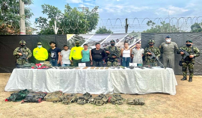 En medio de las capturas, fueron hallados cinco armas largas, tres armas cortas, material de guerra, comunicaciones e intendencia, al igual que brazaletes del Eln y documentos de interés para la inteligencia militar.