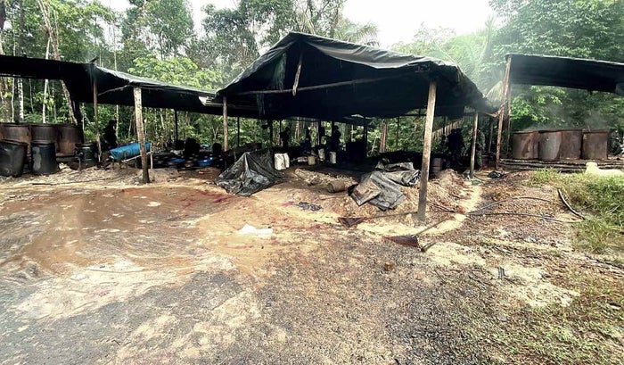 “Tropas allanaron estas dos estructuras ilegales que conformaban dicho complejo de sustancias químicas ilícitas, pertenecientes, al parecer del Grupo Armado Organizado (GAO)- ELN, en donde se encontraron 1.930 kilogramos de insumos sólidos, 2.430 galones de insumos líquidos, 1.100 galones de combustible entre Gasolina, ACPM y diferentes maquinarias y equipos que eran utilizados para el procesamiento y distribución de la pasta base de coca en toda la región”, indicó el coronel Diego Jaramillo Muñoz, comandante de la Fuerza de Tarea Vulcano.