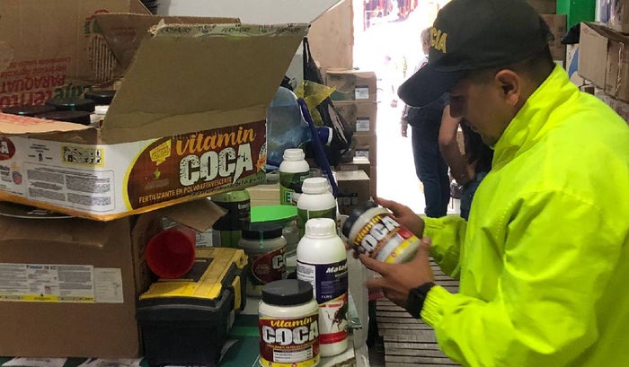 “Dentro de los productos aprehendidos se encontraron fertilizantes de la marca cafeterito llenado de fruto, cafeterito triple 15 cebollón, cafeterito súper levante, cafeterito producción asimismo se hallaron un cargamento de productos ecuatorianos de herbicidas, insecticida de las marcas insectividad, matador, cafeterito paraquat, herbicida bombazo, fertilizante cebollón, cebollín, herbicida arrasador paraquat, fertilizante hojas y follaje, enverdecer, vitamina coca, este último referenciado como un atractivo por el que se engañaba a los encargados de predios de cultivos ilícitos diciéndoles que les aceleraba el crecimiento de la planta sin mediar el riesgo ocasionado al suelo y la infertilidad de los mismos con el tiempo”, reseño la Policía en un comunicado.