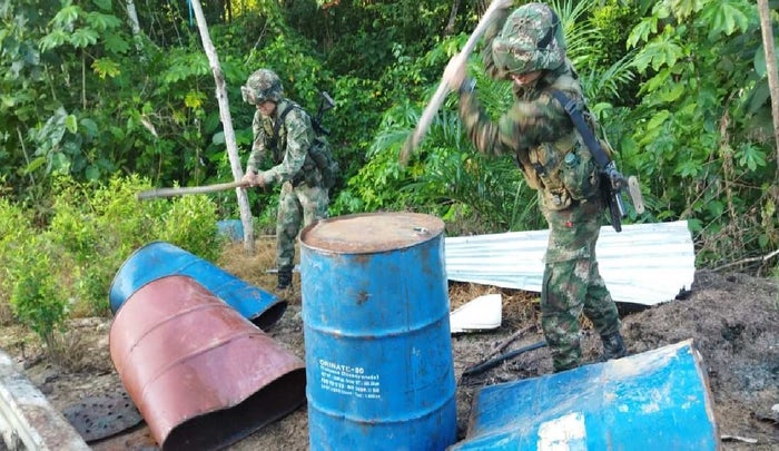 “Esta estructura estaba elaborada en madera, la misma contenía 178 galones de gasolina procesada, 12 galones de ácido sulfúrico, 5 galones de insecticida, 50 kilos de cal, 20 kilos de cemento, 12 kilos de Permanganato Potásico, dos kilos de herbicida y otros materiales utilizados para el procesamiento de este alcaloide” coronel César Alberto Karan Benítez comandante de la Trigésima Brigada del Ejército Nacional.